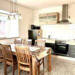 Eine Einbauküche für die Selbstverpflegung mit einem Geschirrspüler ist vorhanden. Der Wohnbereich verfügt über eine große helle Fensterfront mit Blick in Richtung Pferdekoppeln, Felder, Wiesen u. Wälder.