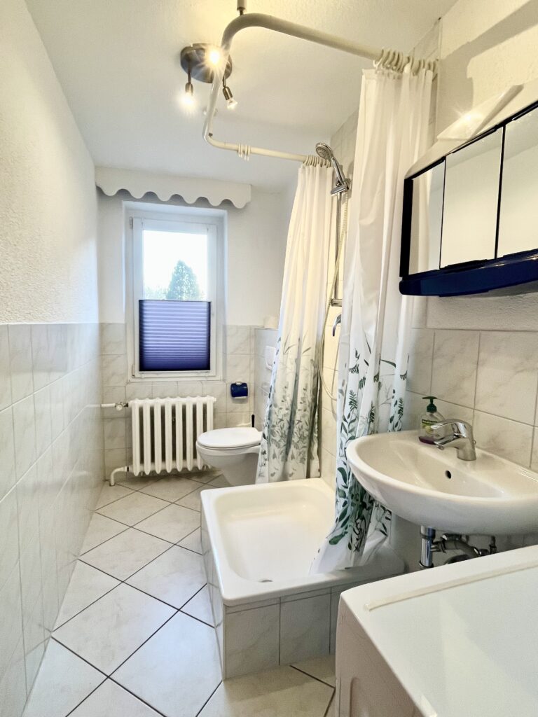 Badezimmer Blick auf Dusche, WC und Fenster