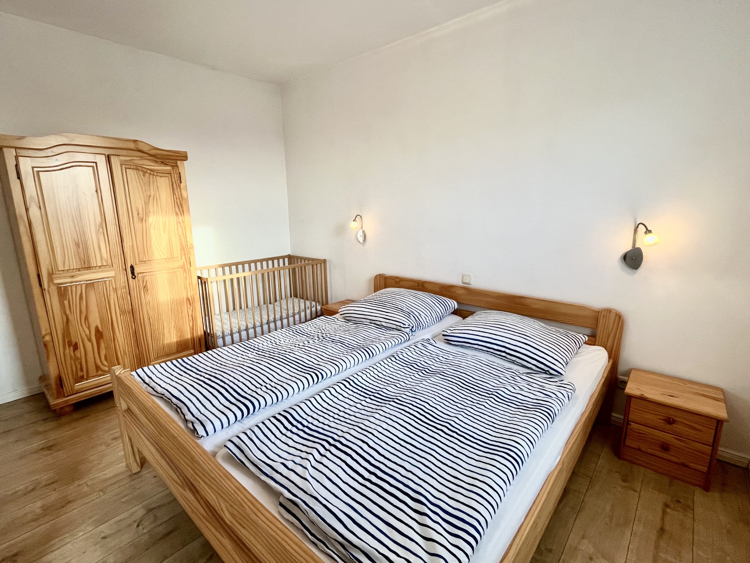 Schlafzimmer mit Ehebett, Kleiderschrank, Kinderbett
